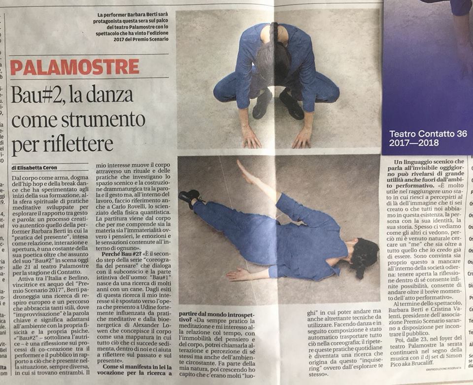 Different, almost surprising, is the direction taken by Barbara Berti with her BAU #1, the first series of BAU ‘Choreography of thinking’ whose second outcome, BAU # 2, was the winner of the 2017 Scenario Award. Matching dance to acting a text to illustrate the possible relationships between language and gesture, as well as the connections between body reality and mental image, Berti enters here in the territory of the meta-choreography. The nostrils that quiver, or the teeth shown in a sneer, confer a desecrating imprint, which will eventually explode into canine onomatopoeia, barking. “Being here, feeling without feeling, listening without listening”: the monologue uttered by Berti deconstructs the choreographic work and its germinative process itself, using a seductive as well as enigmatic phrasing.