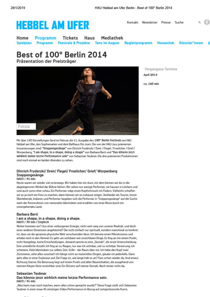 WITH EASY MEANS, “I AM SHAPE, IN A SHAPE, DOING A SHAPE” IS AN AMAZING AND INTELLIGENT PERFORMANCE THAT ATTACHES THE AUDIENCE AND REFLECTS IT AT THE SAME TIME. ON A MULTILAYER LEVEL THE PERFORMANCE SITUATION IS THEMED AND ARTISTICALLY FILIGRANE IMPLEMENTED. BARBARA BERTI CONVINCES PERFECTLY WITH ITS EXTRAORDINARY STAGE PRESENCE, AND SHOWS THAT HUMOR AND SERIOUSNESS CAN BE CLOSELY CLOSED TOGETHER. 1-2 TH APRIL 2014 HAU
